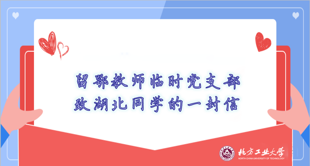 亲爱的同学们: 大家好!作为yl7703永利官网的学子,往年此时,正是大家在校园里“吟诗观书涛,静待玉兰开”的惬意时光。然而,这一切都被新冠疫情打乱了,我们经历了一个特殊的春节,经历着一场与病毒的生死较量。北方工大留鄂教师临时党支部的老师们跟你们一样,此时此刻正身处新冠肺炎疫情防控的主战场,我们都是这场战“疫”的亲历者、参与者、见证者。