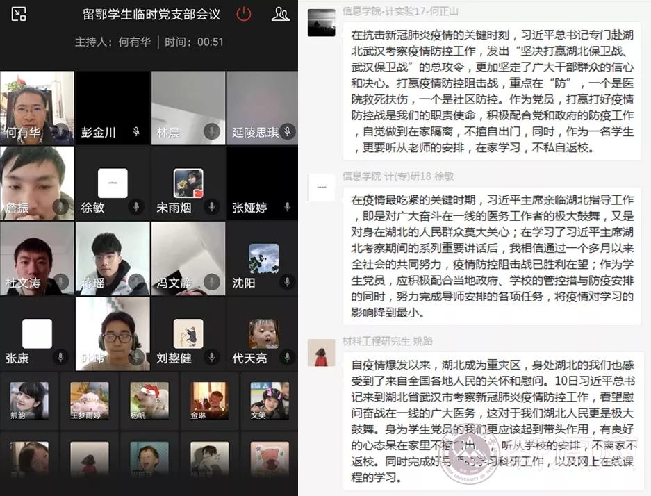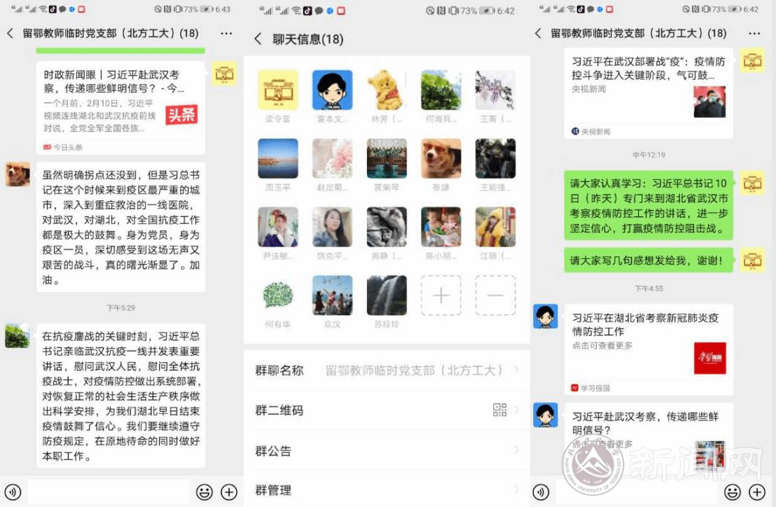 3月11日,北方工大留鄂教师临时党支部利用微信群组织在线学习习近平总书记重要讲话精神,交流学习体会。支部党员袁本文说,在湖北疫情防控形势积极向好并取得重要成果的关键时刻,习近平总书记视察武汉,高度评价一线医护人员和基层抗疫人员的工作,充分肯定了武汉人民为阻击新冠病毒做出的牺牲与奉献,极大地提振了武汉乃至全国人民战疫必胜的坚定信心,再次彰显了大国领袖的担当。支部党员梁令富表示,疫情发生以来,党中央明确要求把人民群众生命安全和身体健康放在第一位,所有防控措施都首先考虑尽最大努力防止更多群众被感染,尽最大可能挽救更多患者生命。这是人民至上理念的生动诠释。支部党员何海兵说:习近平总书记亲临武汉抗疫一线并发表重要讲话,给我们湖北早日结束疫情鼓舞了信心,我们要继续遵守防疫规定,在原地待命的同时做好本职工作。支部党员王菁表示,作为一名在汉教师党员,一定谨记习近平总书记指示,遵守政府和学校规定,做好疫情防控,做好远程网络教学工作。支部党员张婕说,习近平总书记在这个时候来到疫区最严重的城市,对武汉,对湖北,对全国抗疫工作都是极大的鼓舞。身为党员,身为疫区一员,深切感受到这场无声又艰苦的战斗,真的曙光渐显了。加油!入党积极分子贾荣琴在发言中说,习近平总书记同社区工作者、基层民警、卫生服务站医生、下沉干部、志愿者交流,充分肯定了社区在抗疫中发挥了重要作用,让我们这些在社区当志愿者的同志们倍受鼓舞。